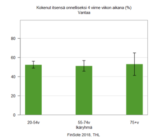 Lue yllä olevasta tilastokatsauksessa Kansallisen terveys-, hyvinvointi- ja palvelututkimuksesta (FinSote) kerättyjä havaintoja yli 20-vuotiaan aikuisväestön koetusta hyvinvoinnista Vantaalla. Katsaus esittää tuloksia neljästä tärkeästä koetun hyvinvoinnin teemasta: koettu terveys, psyykkinen kuormittuneisuus, työkyky sekä yksinäisyys ja osallisuus